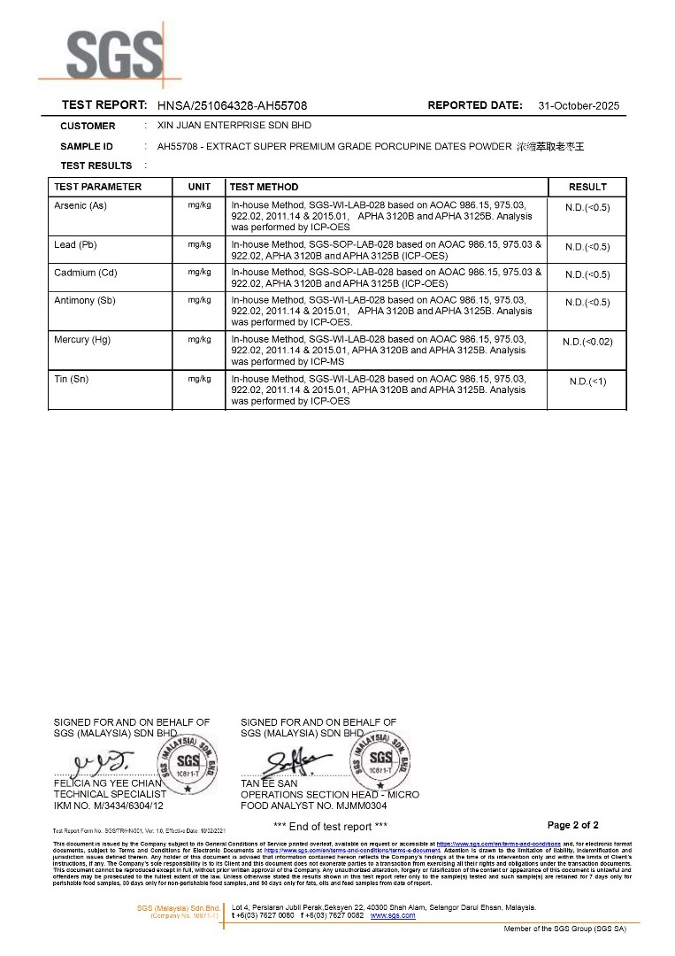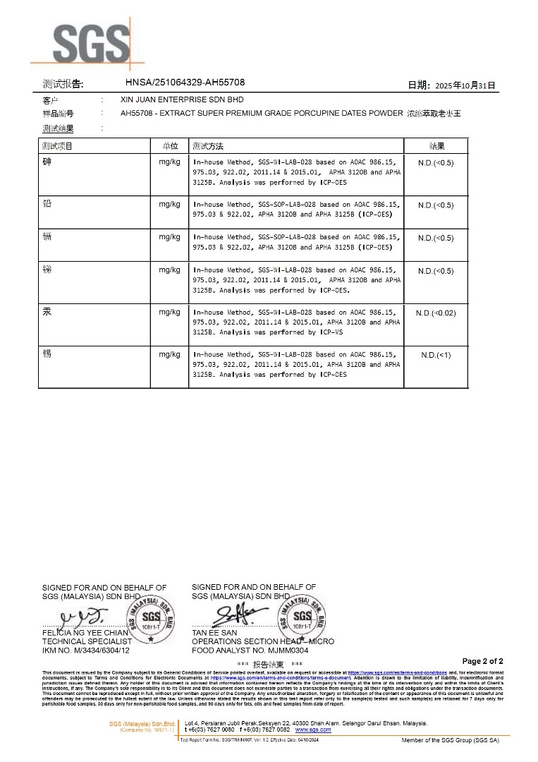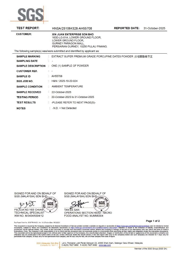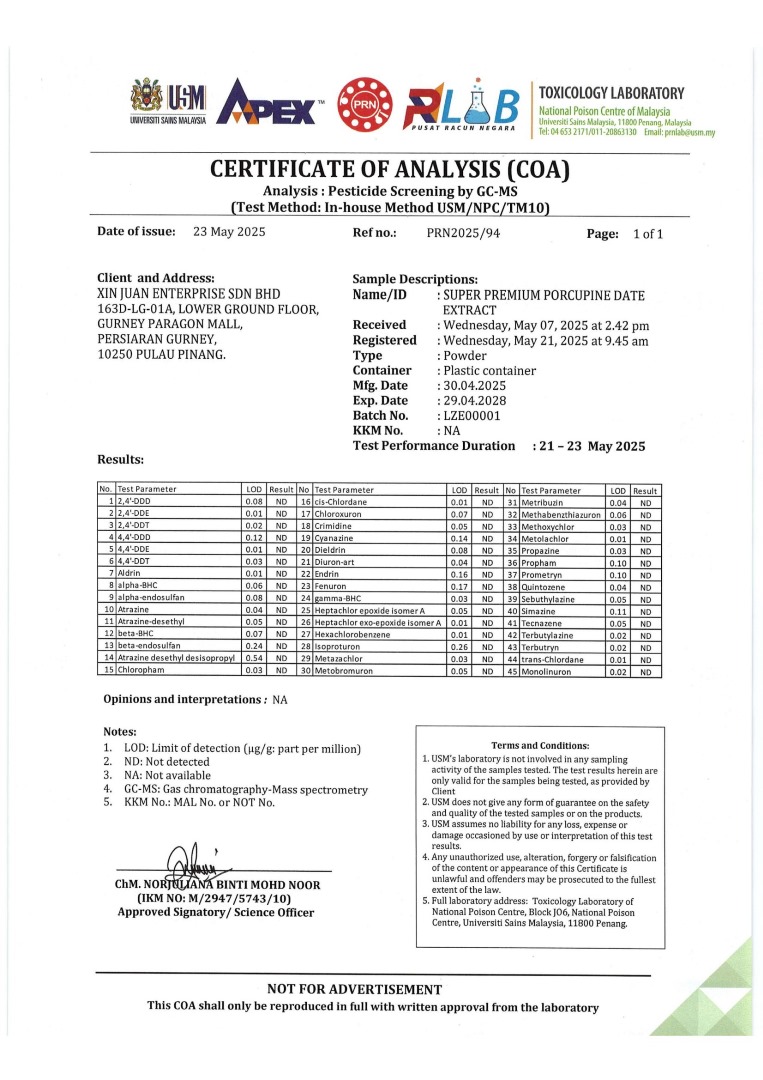 ✅ 野生部买卖准证 ✅ 马来西亚箭猪枣准证 ✅ USM 有害物质化验检测报告 ✅SGS 化验报告 ✅ 单宁成分化验报告 ✅ 菠萝蛋白酶成分化验报告 ✅ 氨基酸分析报告